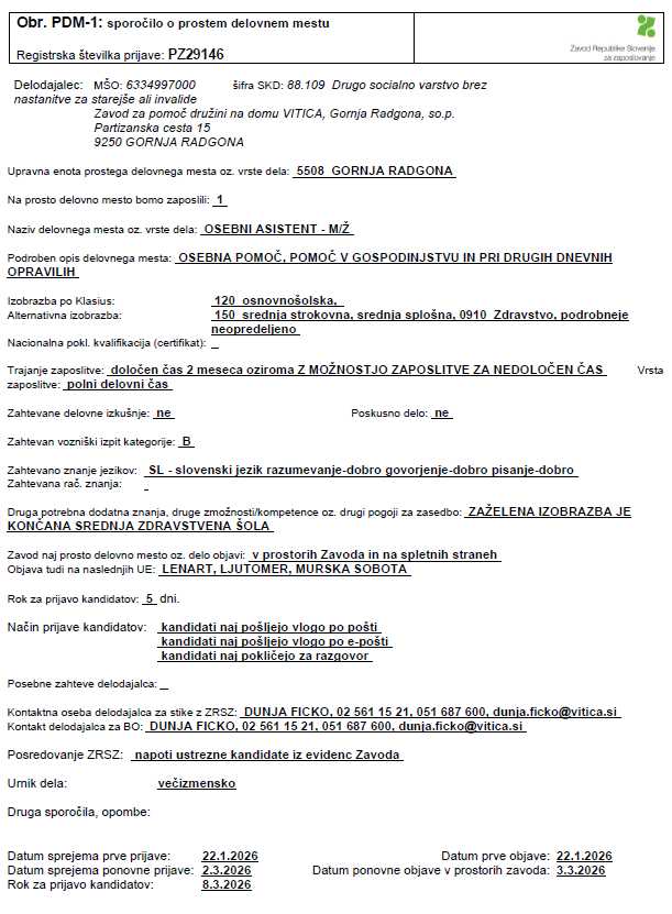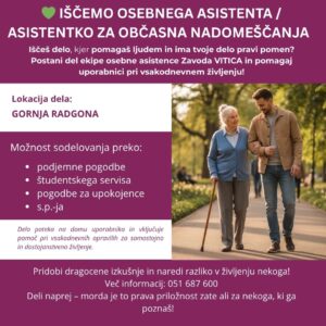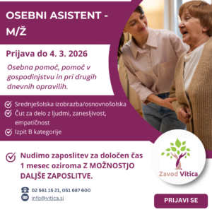 21. oktobra 2025 Če imate radi delo z ljudmi, se pridružite naši zgodbi! Pridružite se nam in pomagajte soustvarjati boljšo prihodnost! Ostale aktualne novice 10. marca 2026 VEČGENERACIJSKI CENTER POMURJE – ENOTA ZAVOD VITICA 9. februarja 2026 VEČGENERACIJSKI CENTER POMURJE- ENOTA ZAVOD VITICA 6. januarja 2026 VEČGENERACIJSKI CENTER POMURJE-ZAVOD VITICA 18. decembra 2025 Namenite 1 % dohodnine za donacije Kontaktirajte nas Tukaj smo za vas +386 (02) 561 15 20